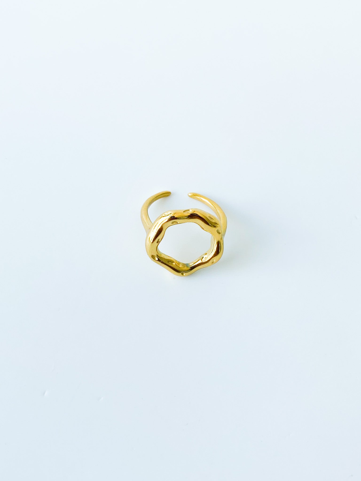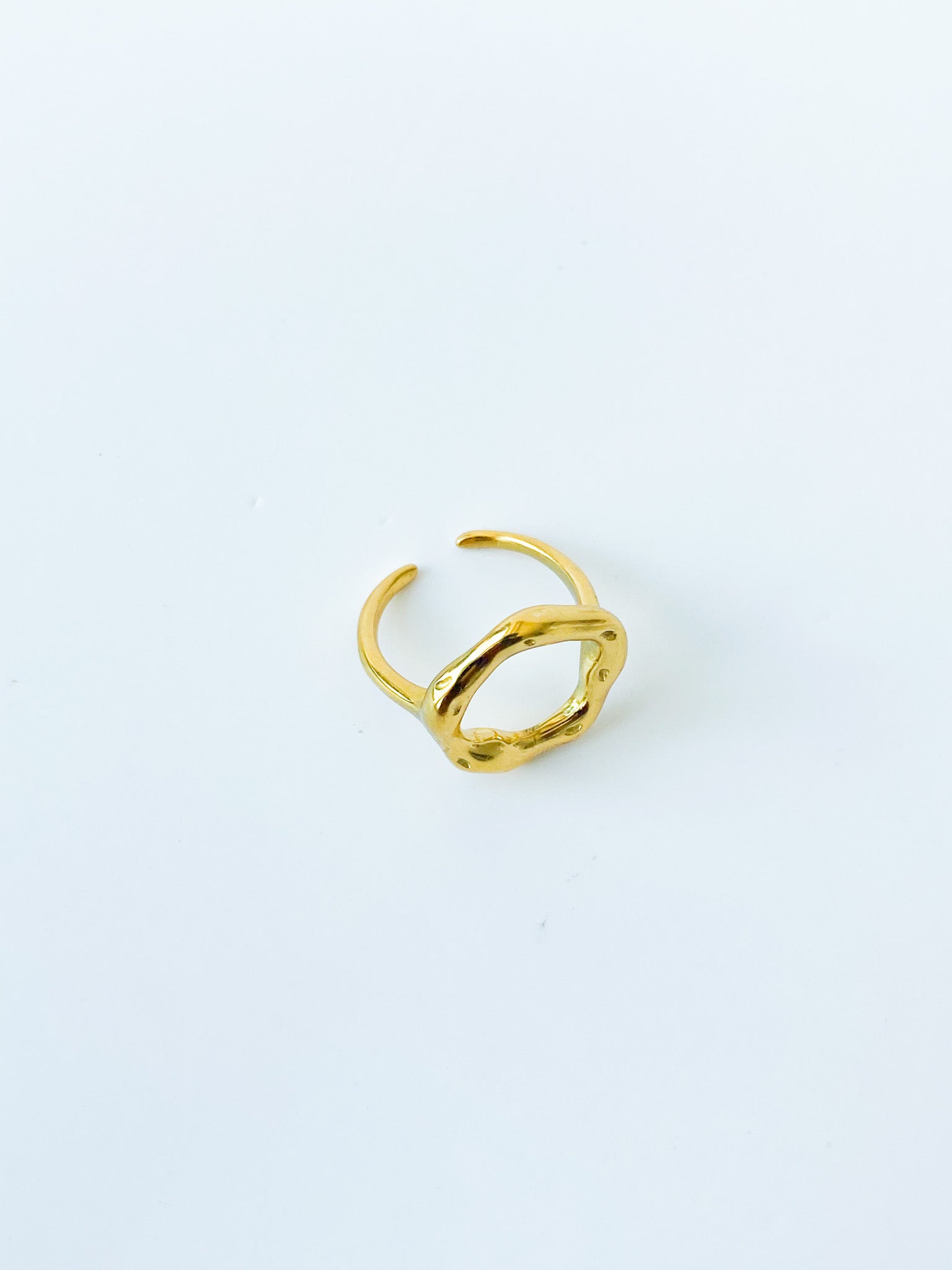La bague Bella plaqué or présente un design élégant avec un cerceau irrégulier qui ajoute une touche artistique et moderne. Fabriquée à partir d'acier inoxydable de haute qualité et plaquée avec une couche d'or 18 carats, cette bague allie robustesse et éclat luxueux.
