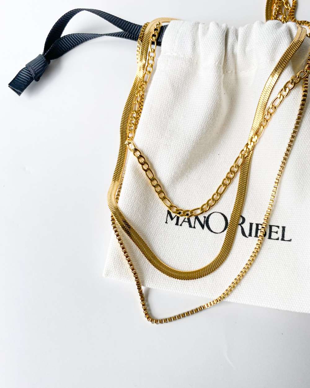 Le collier 3 en 1 Caroll est une véritable pièce centrale de notre collection. Le premier collier, avec sa forme de serpent, évoque le mystère et l'audace, tandis que le deuxième collier, fin et minimaliste, apporte une touche de sophistication à votre tenue. De plus, le troisième collier complète l'ensemble avec des maillons élégants, ajoutant de la variété à vos choix de style. Fabriqué en acier inoxydable et recouvert d'une épaisse couche d'or 18 carats, cet ensemble est conçu pour briller non seulement lors des fêtes, mais également dans votre quotidien.