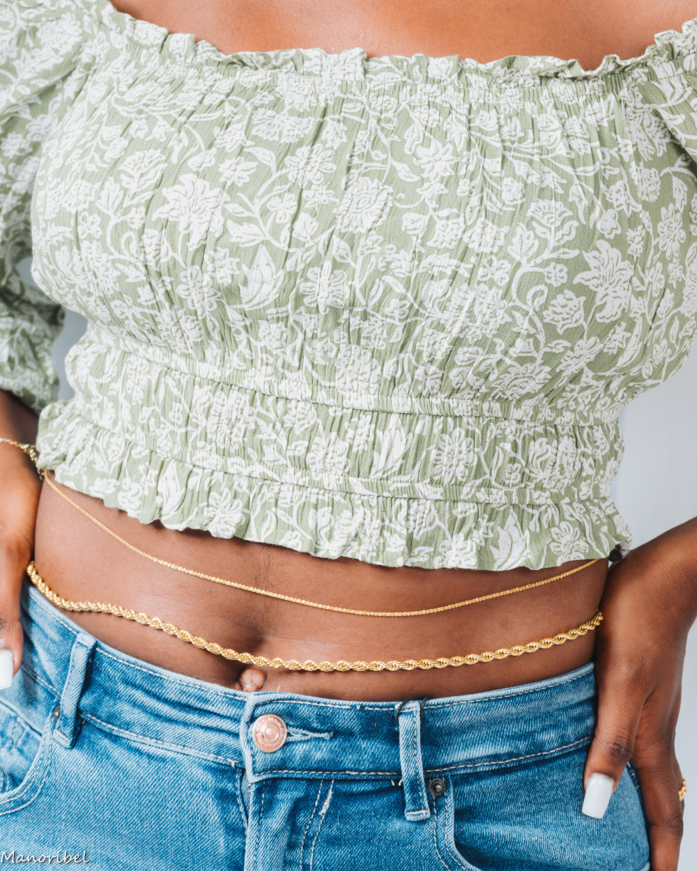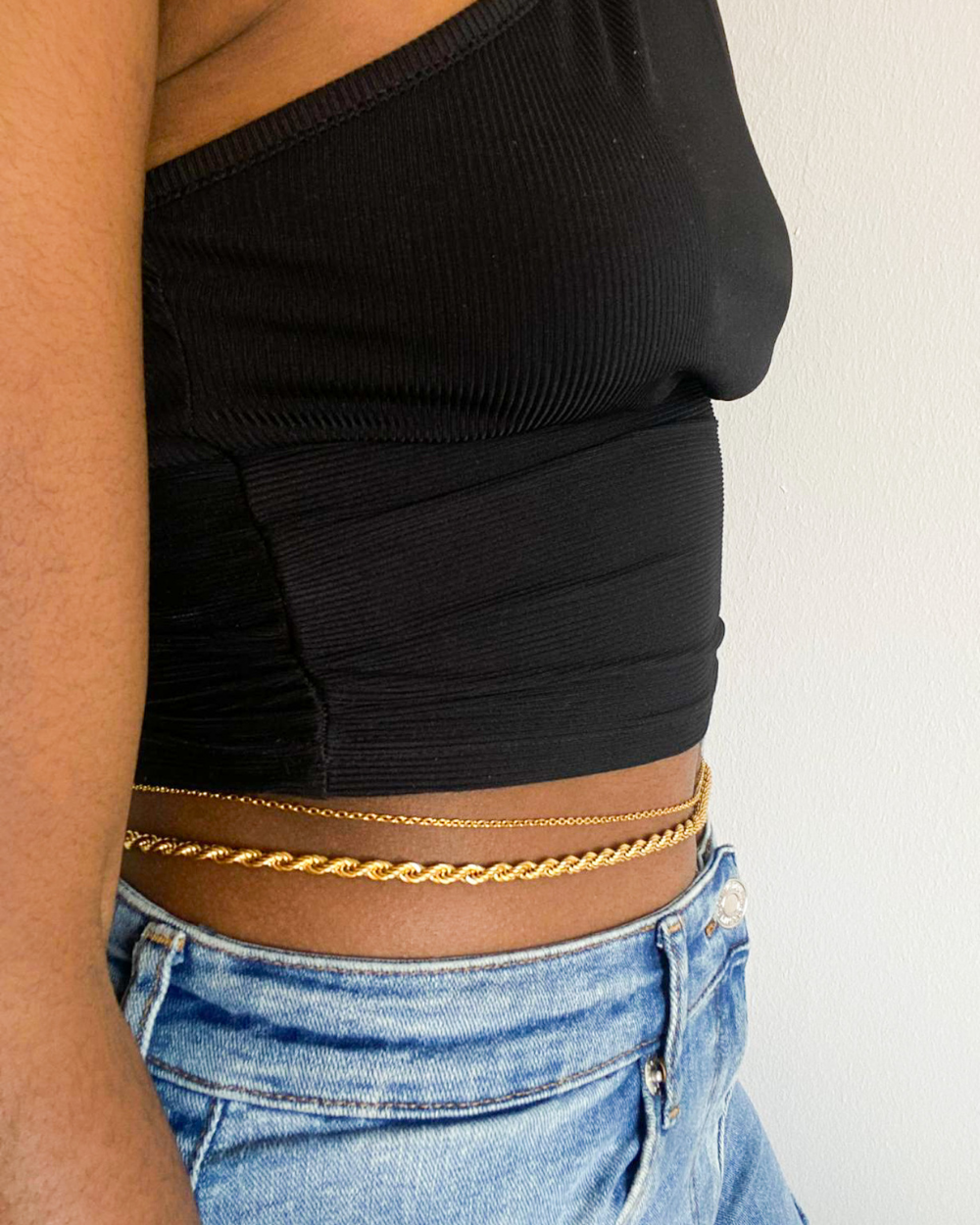 Portez cette chaîne de rein audacieuse en plaqué or 18 carats avec nos autres chaine pour une déclaration de style qui ne passera pas inaperçue. Elle est idéale pour les tenues de soirée, les robes de cocktail ou même pour ajouter une touche glamour à votre maillot de bain sur la plage.