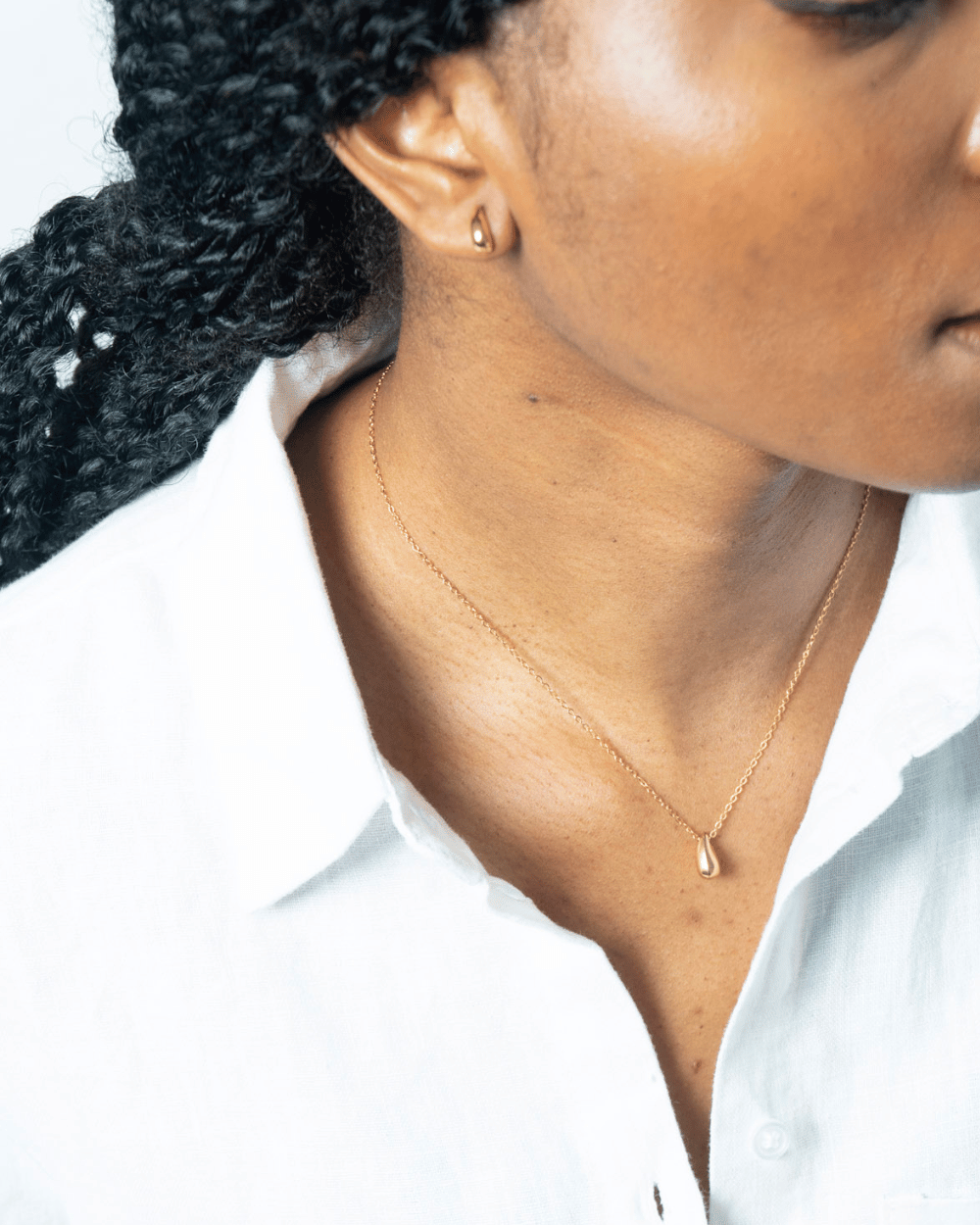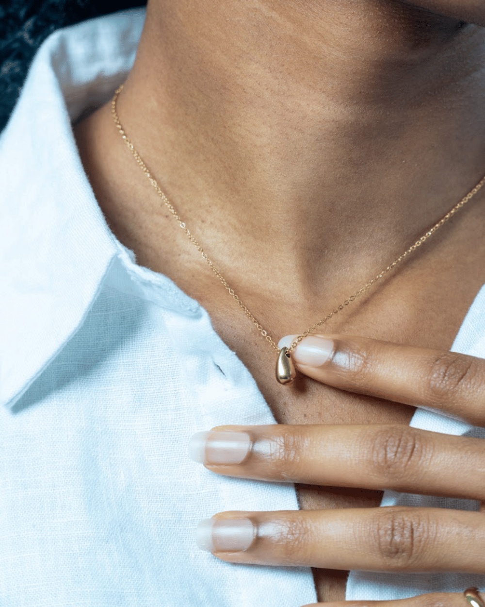 Tous les regards seront tournés vers vous grâce à ce collier au design minimaliste avec son pendentif unique en forme de goutte d´eau qui ne passera pas inaperçu. Confectionné à la main à base d´un matériau solide qui ne perds pas son éclat, il est ensuite recouvert d´une épaisse couche d´or 18 carats. C´est la version revisitée du collier classique conçu pour vous donner une allure élégante et raffinée. La sophistication à votre cou. Portez-le en ensemble avec sa boucle d´oreille assortit ainsi qu´avec une chemise blanche déboutonnée pour un effet incroyablement sophistiqué.