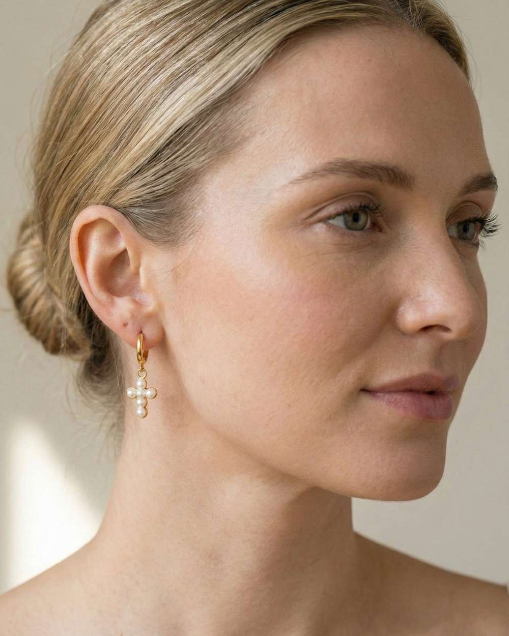 Nos mini créoles Pearl sont l’alliance dansante entre le cercle infini et le symbole sacré. Elles marient la simplicité d'un anneau doré à la pureté d'une croix perlée pour créer un bijou qui accompagne tes mouvements avec douceur. Elles ont été conçues pour adoucir les traits de ton visage tout en affirmant ta foi en toi-même.